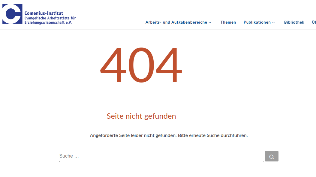 ### Zu 404 So sah das auf der alten WP Seite aus: ![image](/attachments/14a194c9-6163-4ee4-82aa-6a5c81090a20) Auf deutsch und Suchfenster. So sieht es auf comenius.de aus: ![image](/attachments/83624654-1609-4ebc-872a-0b69e4e4a686)