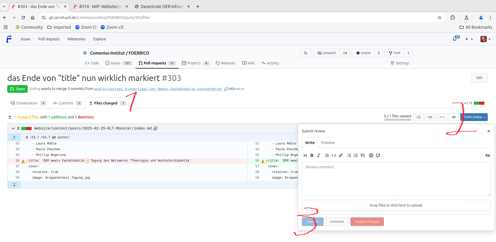 das Ende von "title" nun wirklich markiertto WIP: das Ende von "title" nun wirklich markiert- Neuerungen übernehmen, aus dem Brach "main" in diesen Branch ("bugfix/correct_blogartikel-oer-meets-fachdidaktik-syntaxfehler") - Konflikt in Metadatum "title" (static site generator) lösen: fehlendes AnführungszeichenWIP: das Ende von "title" nun wirklich markiertto das Ende von "title" nun wirklich markiert@joerglohrer wenn du keine Einwände hast, kannst du den PR freigeben.