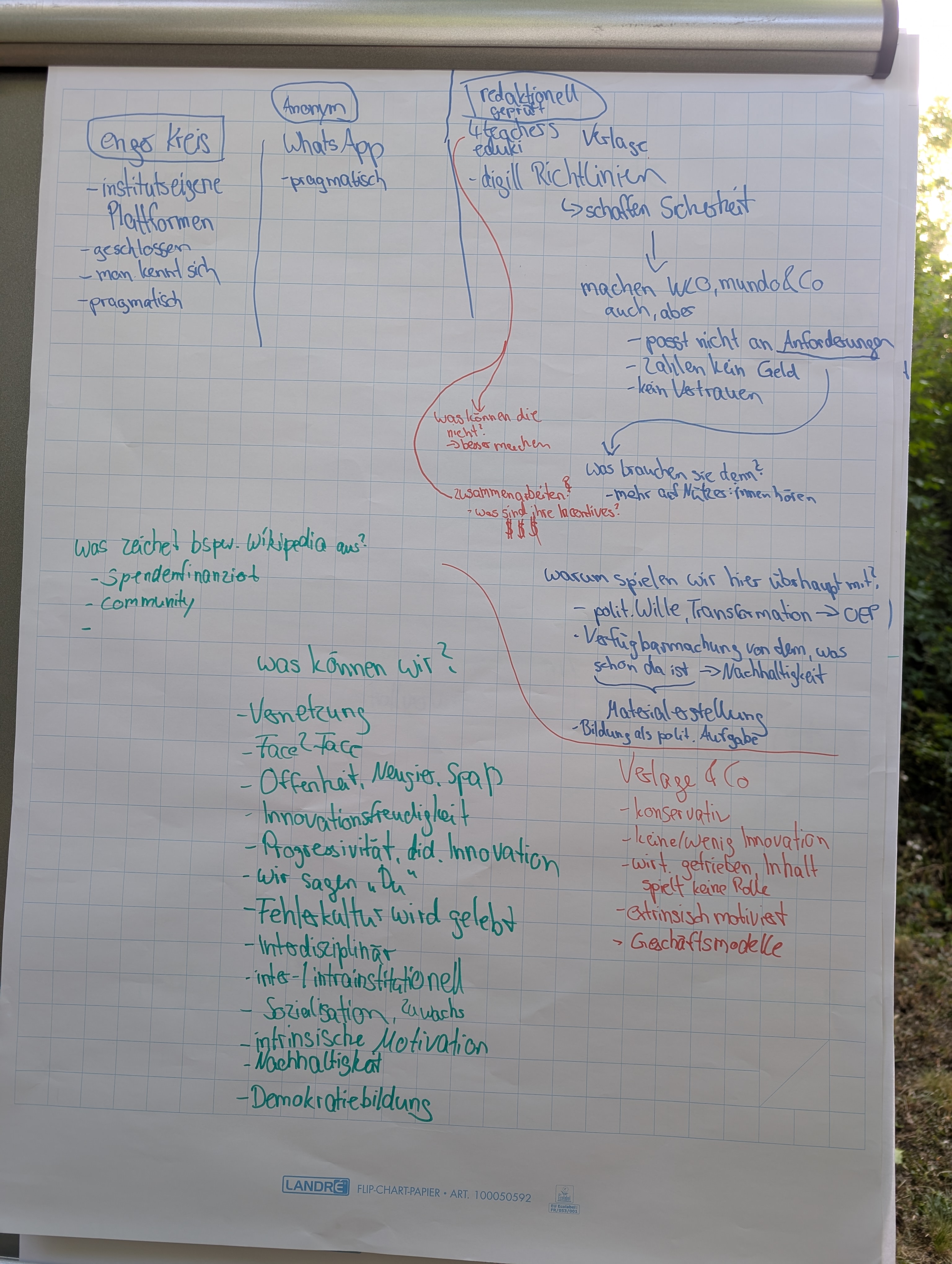 Wir vom FOERBICO-Team waren vorwiegend beim Edufeed-Workshop, um mit weiteren Interessierten weiter an der Idee einer dezentralen Bildungsinfrastruktur zu denken. Dazu haben wir zunächst überlegt, wo das Teilen von Bildungsmaterialien schon funktioniert und sind zu folgenden Ergebnissen gekommen: