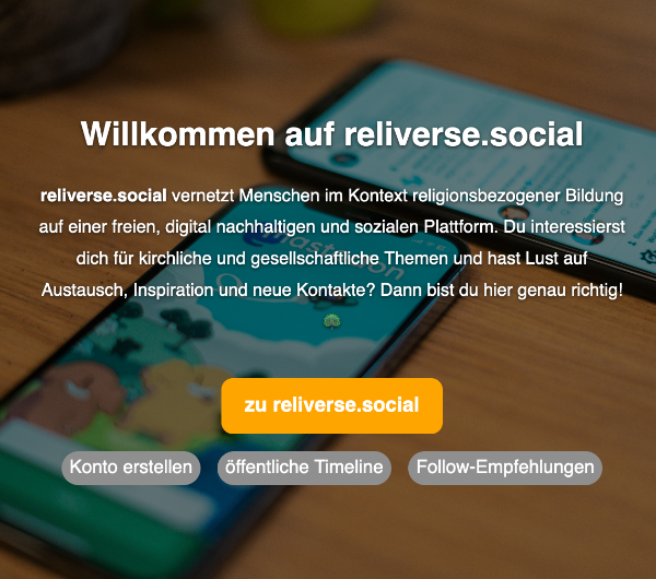 Unter https://startodon.oer.community gibt es einen Einstieg mit Empfehlungen zur religionsbezogenen Bildung und die herzliche Einladung an Religionslehrkräfte, Ehrenamtliche oder Fortbildende sich auf https://reliverse.social zu registrieren, anzumelden und mit uns in den offenen Austausch zu kommen.